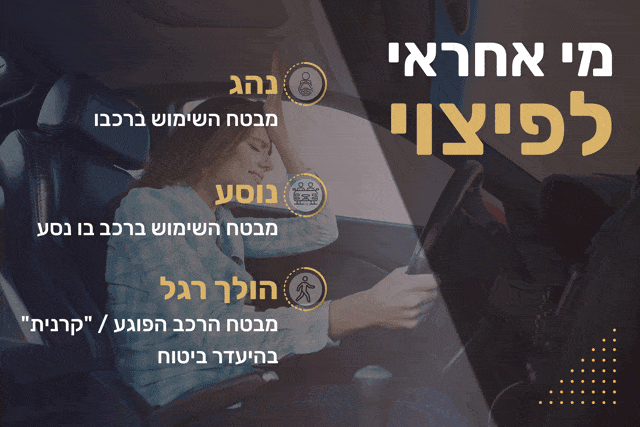 לאחר שאדם נפגע בתאונת דרכים, עולה לרוב השאלה: מיהו הגורם האחראי לפיצוי? ובכן, כל תאונה שונה בנסיבותיה, ולפיכך יש לבחון תחילה את זהות הנפגע, כמפורט להלן: